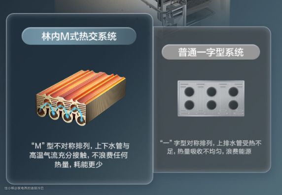除此之外换热器也得到了升级,搭载了林内M式换热器,其他品牌搭载的是一字式换热器,上排水管受热不足,热量不均匀。而M式换热器的上下水管与高温气流充分接触,从而既提高了热效率,又更加节能。
