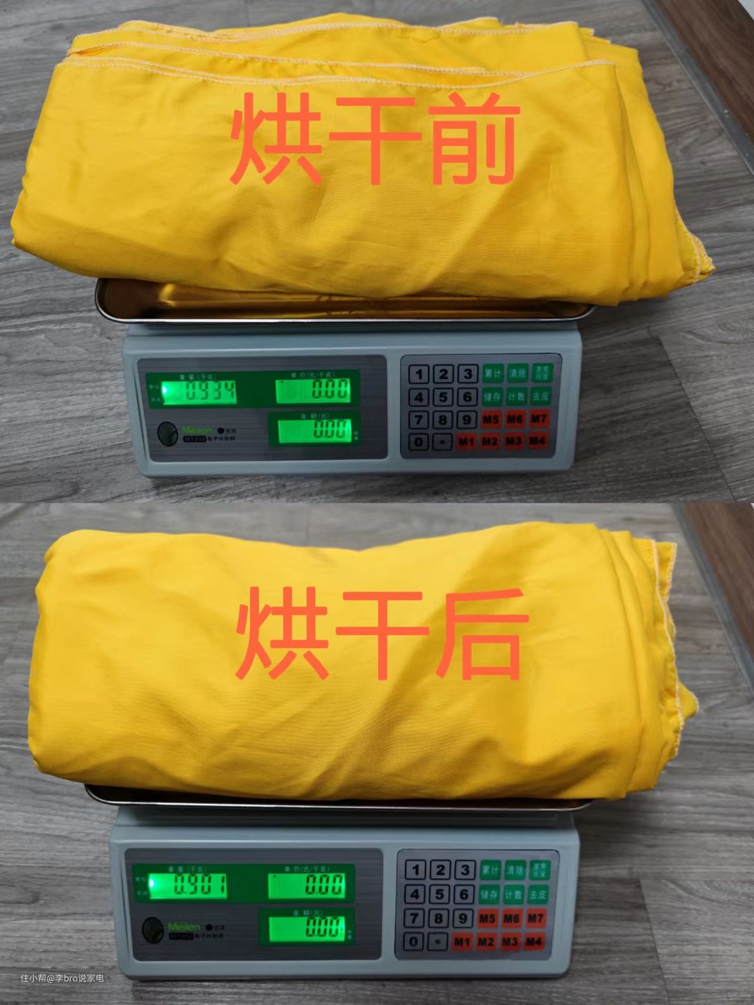 - 测试结果:烘干前被单重量为0.934KG,烘干后为0.901KG,计算出含水率为-3.66%,摸起来十分地干爽,测试的结果十分不错。