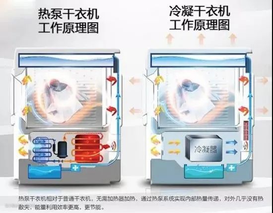 热泵式烘干机在冷凝器的基础上再次升级,增加了热泵系统,即压缩机和散热器,通过热泵产生热量,可以将烘干时的温度控制在60℃以下,这样的烘干温度更加适合大多数的衣物材质,减少对衣物的损伤。常见的热泵式为洗烘套装。