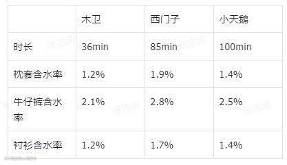 在含水率上,枕套含水率最低的是西门子烘干机;牛仔裤含水率最低的是木卫烘干机;衬衫含水率最低的是西门子洗衣机。