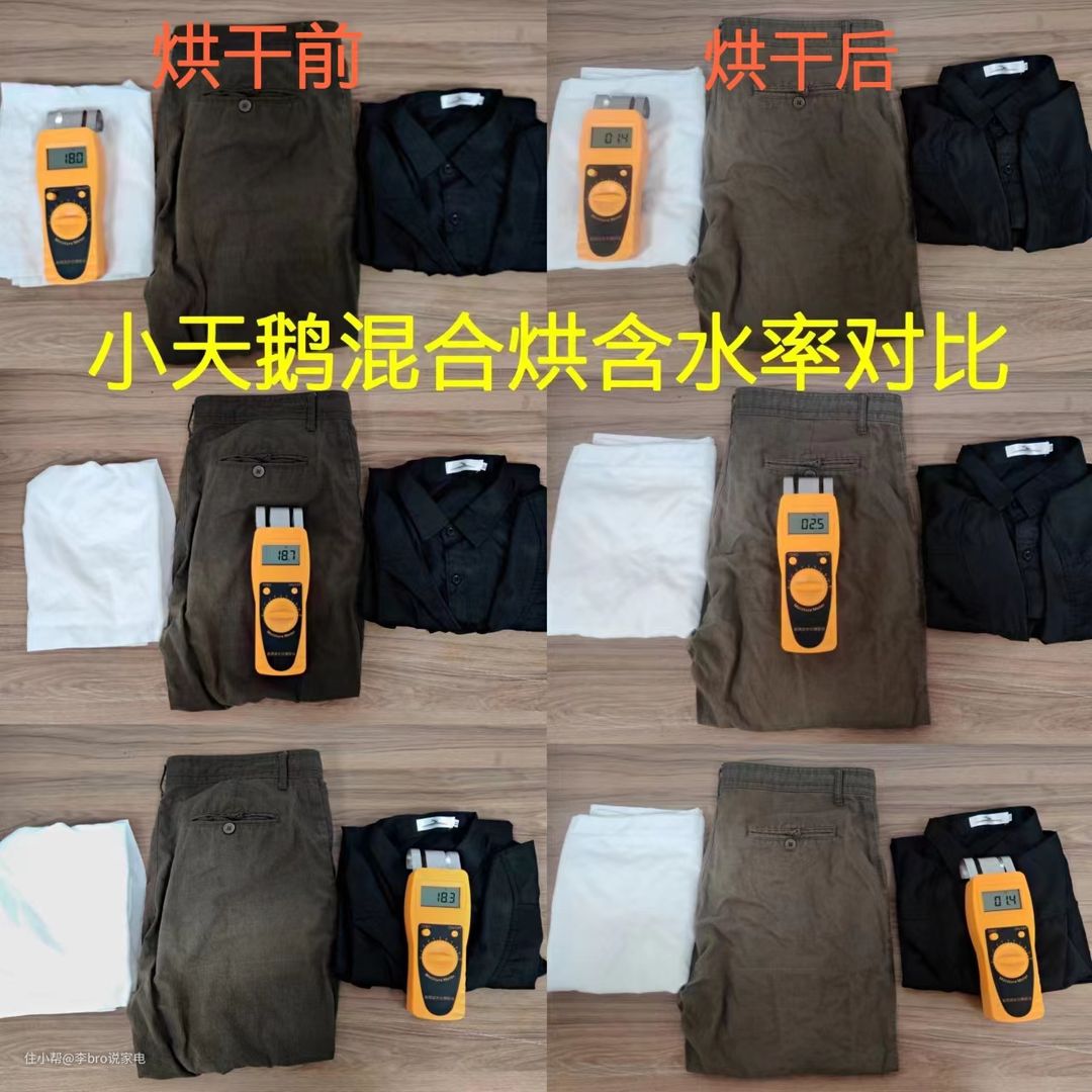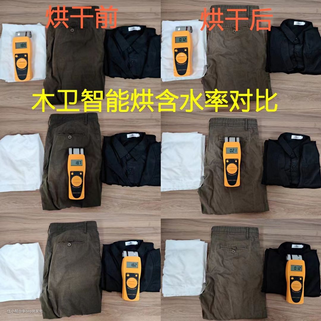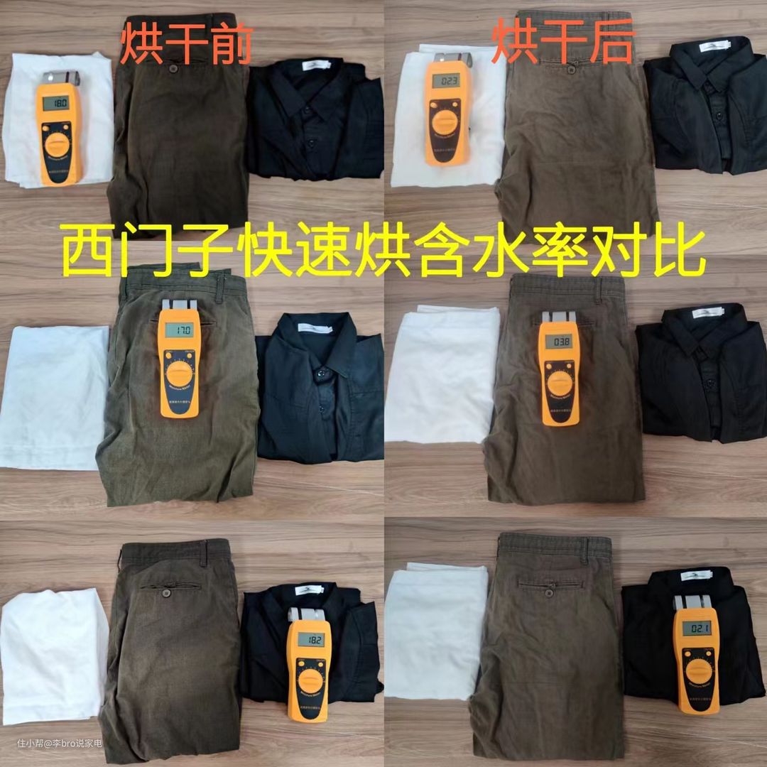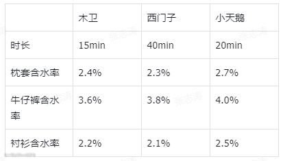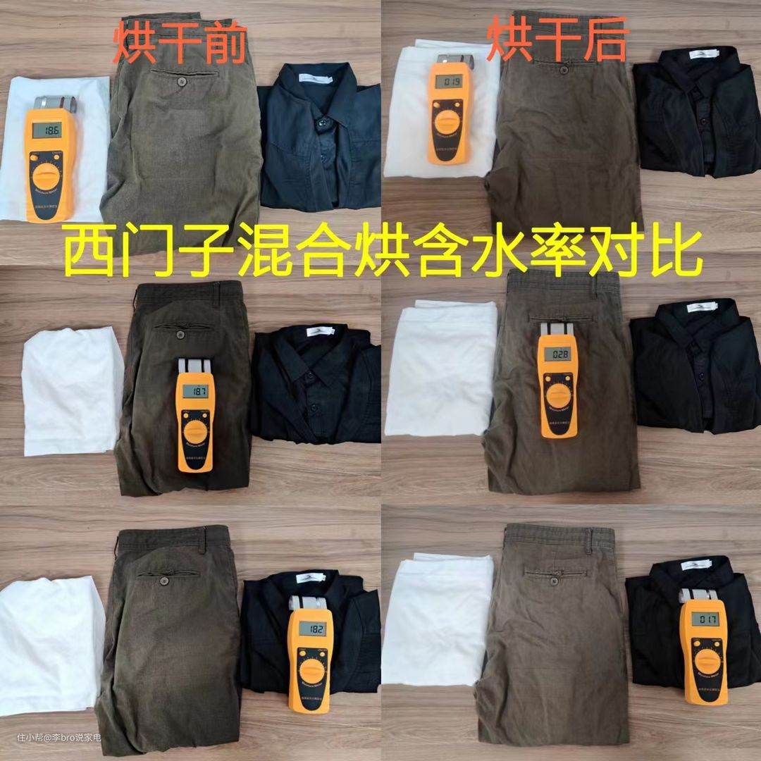 当衣物变得干燥时,温度会逐渐降低,做到衣干即停。对于是否达到衣干即停技术,我们可以对衣物烘干前后的含水率辨别,可以通过衣物的含水率进行测试: