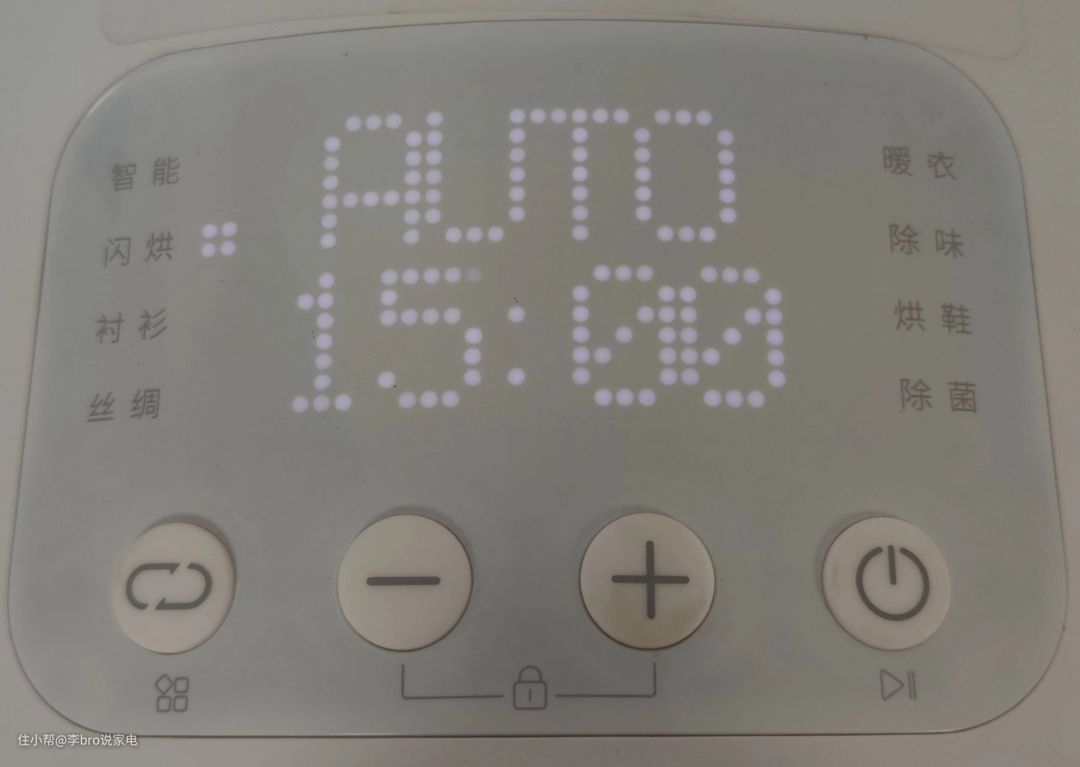 下图为木卫C1的控制面板,可以看到有智能、闪烘、衬衫、丝绸、暖衣、除味、烘鞋、除菌8种模式,可以满足不同的衣物的护衣需求。