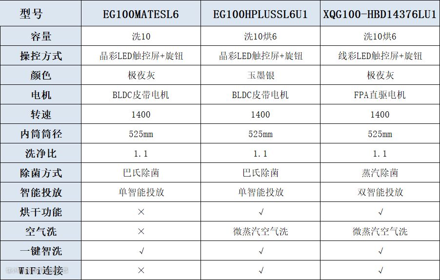这款的洗衣机其实就是最上面的那款单洗的EG100MATESL6,配置大家都知道啦,我就不再重复,具体的还是要看看烘干机的性能配置。