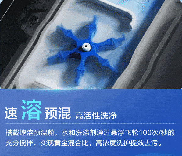 而精华洗技术可以在洗涤剂流到滚筒之前,就已经通过预混舱里的两个飞轮高速转动来将水和洗涤剂充分混合,能够提前激发洗涤剂的活性。