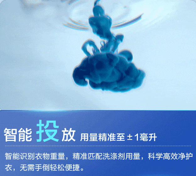 智能投放可以很好的避免因为手动投放,导致倒多了会有洗涤剂残留在衣服上引起皮肤过敏,倒少了衣服洗不干净的难题。