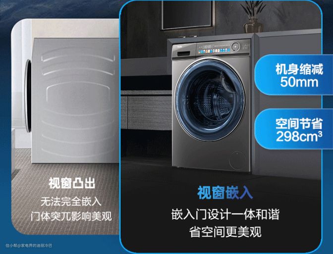 反观,精华洗系列机型采用的是超薄设计,相比传统滚筒洗衣机来说,机身缩减了50mm,而且是内嵌式视察窗,颜值非常高。