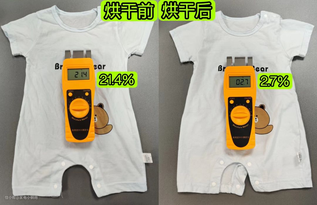 小结:通过烘干前后的对比,可以发现烘干的效果非常好,摸起来就十分干爽了。烘干后的衣物含水率降低至了,而含水率达到5%以下其实就已经达到上身或储藏的标准了。