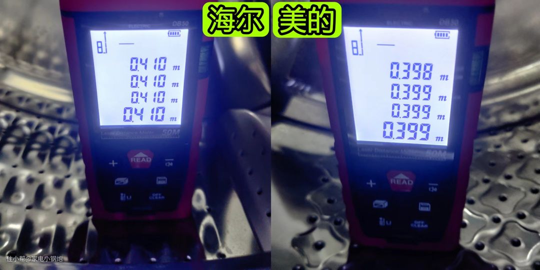大筒径可以让衣物拥有更大的舒展空间,从而可以减少衣物出现的褶皱情况,下图为实际测量的两者内筒筒径: