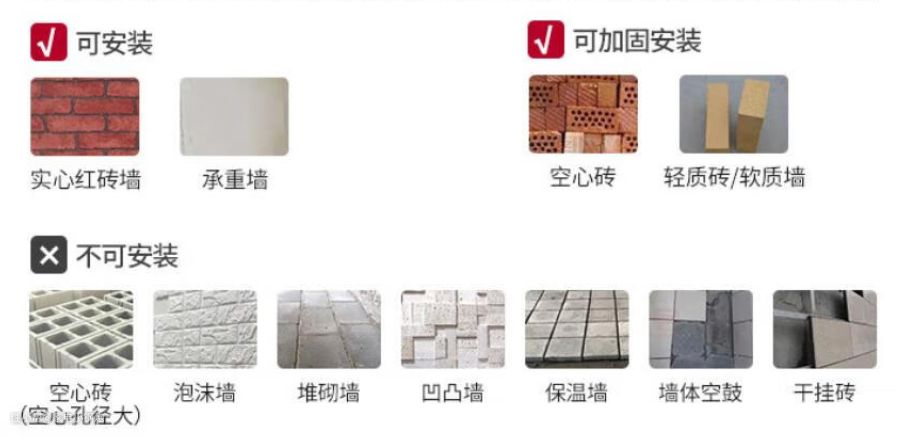 为了方便大家了解自家墙体是否达到符合的墙体要求,下面也给大家整理了一些可安装或不可安装的墙体类型:
