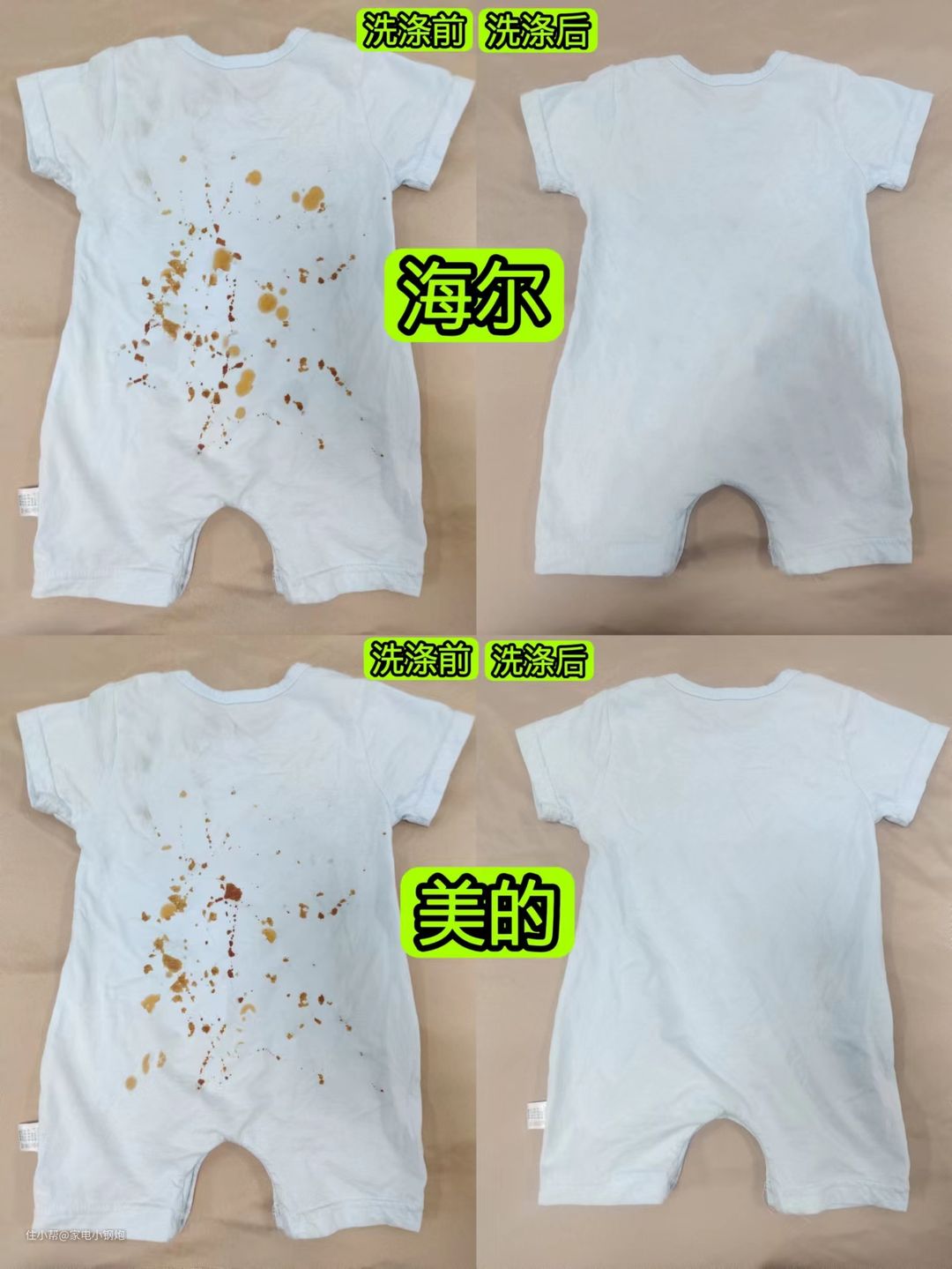 但是通过观察洗涤后的两件衣物,可以发现经海尔洗涤后的婴儿服会更加平整,而美的的会稍显褶皱。我认为这是由于筒径的不同造成的。