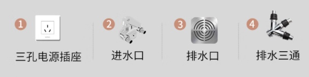 关于水的方面则有进水口跟排水口两个地方,进水口需要4分口水龙头/角阀;而排水口需要有地漏/排水管道。
