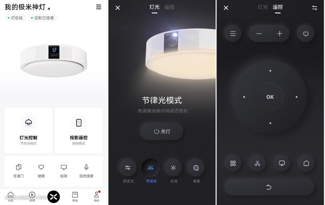 吸顶灯有4个开关方式,第1个就是语音控制;第2个就是遥控器;第3个是无线开关面板,但无模式切换;第4就极米APP控制。下图是通过手机极米APP操控的截图: