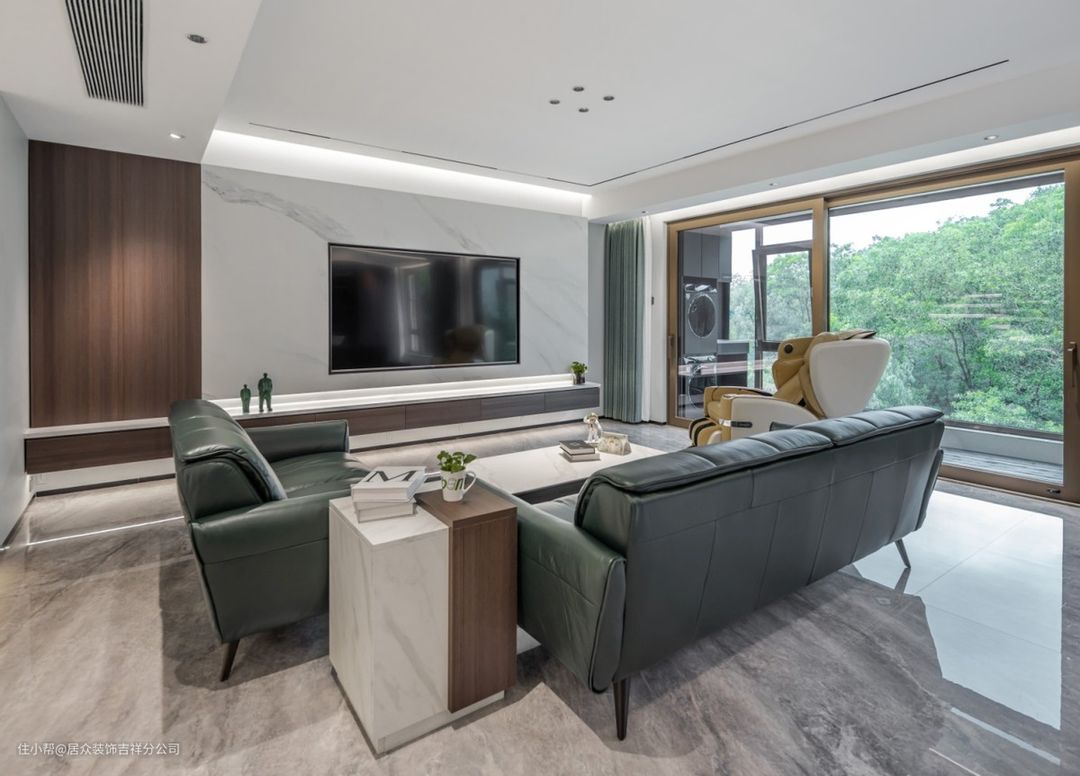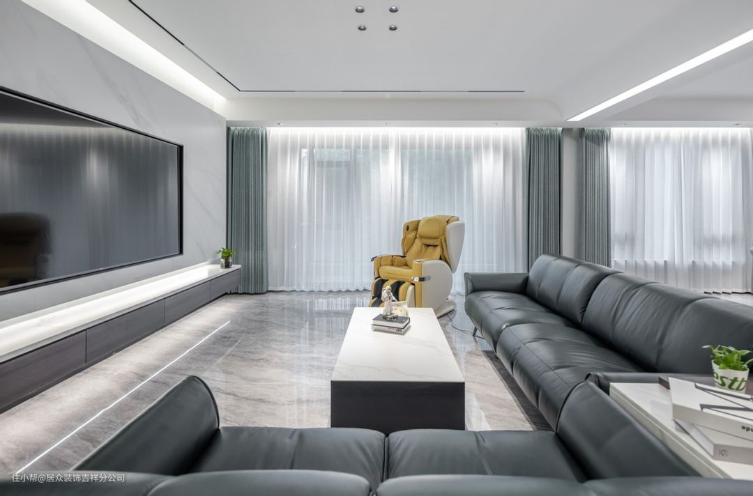 ④一定要在底板上再开一个槽,嵌入灯带,这才是悬空电视柜的完全体。但要注意,如果地面是亮光砖,要用倾斜角度的灯带打墙,不要直接照射在地面上,哑光砖跟柔光砖请随意。