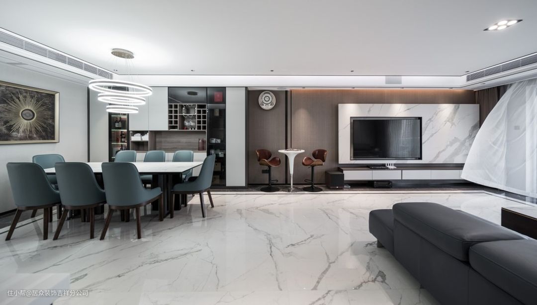 ②大家都清楚,悬空电视柜是越长越好看,但是国产的板子一般都只有两米四长,进口的板子的两米七五,三米以上的电视柜怎么办呢?超长的电视柜,尽量选择木纹色的台面,跟纯色相比,木纹的缝隙会不那么明显,也可以顺着抽屉的缝隙进行中分,会让缝隙更加的自然。