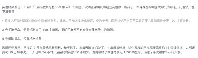 比如之前丁香医生曾经针对这个问题进行过科普:他们将一双日常换洗的袜子的两只分别进行了手洗和机洗,并统计了换洗前后的细菌总数。结果发现,手洗样品检出了108个/mL的细菌,约为洗前一半左右,不过机洗的则完全无法检出细菌了。对于连穿三天以上的内衣,机洗效果也相当出众:洗前菌落超过10万的袜子经过机洗+烘干,洗后细菌仅检出21个,远超手洗。