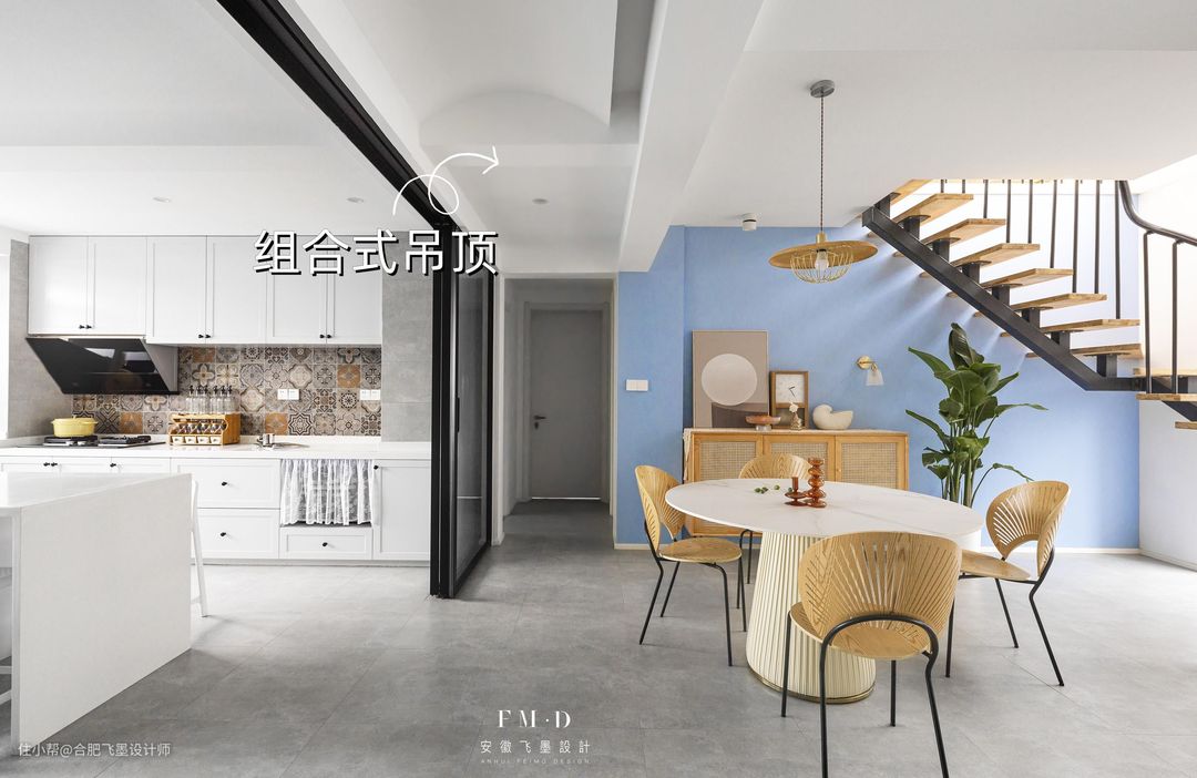 以这家客餐厅中间的过道为例,整个天花板都用木饰面严严实实包起来,和周边大片留白的墙面融合到一起,原木+白,营造一个温馨的居住氛围。