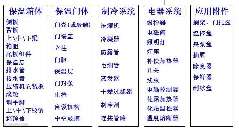冰箱主要由保温箱体、保温门体、电器系统、制冷系统与应用附件五大部分组成。