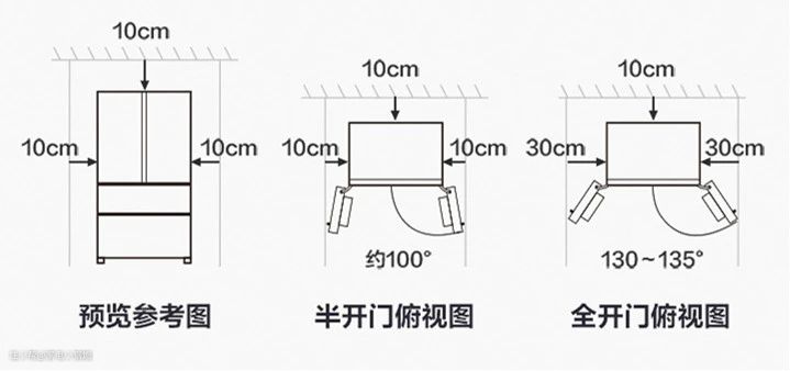 常见的独立式冰箱最好在两边预留10cm的散热空间与开门空间,当然也视机体型号而定,一些超薄冰箱则不需要预留太多空间。