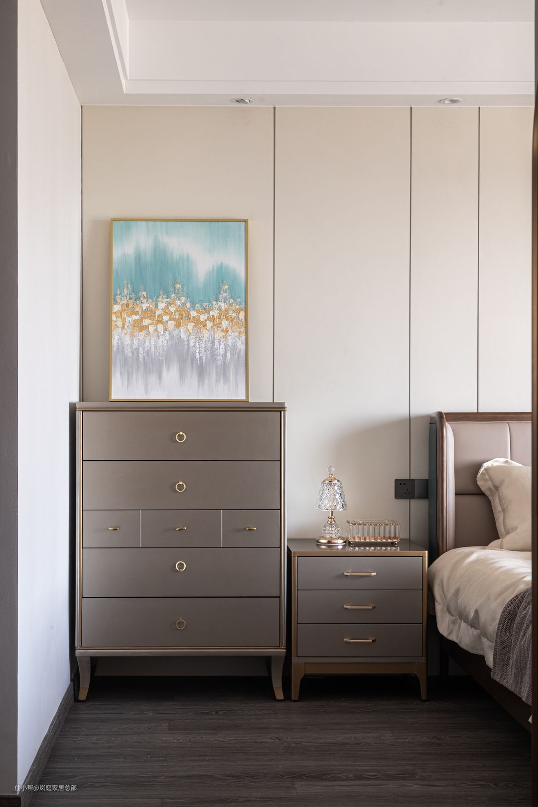 主卧空间以简洁为主,没有繁琐冗杂的装饰设计,延续客厅的边吊设计安装筒灯照明,让空间照明有层次感。床头背景墙采用米色护墙板装饰,让整个居住空间内敛不失格调。 选择浅咖色床头柜放置在床头,装饰画的加入让空间更清新雅致,给居住者带来静谧舒适的居住氛围。主卧的配色还是以浅色为主,深色会显得压抑,浅色却更能符合居住者的喜好,墙面选择象牙白乳胶漆装饰,护墙板采用米色,能缓解白色带来的单调质感。 和公共空间不同,卧室选择通铺木地板,温润柔和的木质元素与白色墙面相互补充,真正做到比例控制得当。