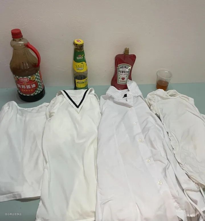 测试的材料也简单,我都是随手从家里拿的,分别是酱油、耗油、番茄酱和隔夜茶水,然后分别将衣服涂上对应的测试污渍材料,抹开后用吹风机把污渍吹干,然后晾晒三个小时,再丢进洗衣机里。
