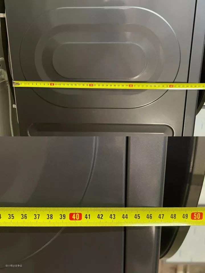 但我手中的小天鹅洗烘套装,我用卷尺测量了下洗衣机和烘干机的厚度,大概在47cm左右。相比于小天鹅其他常规款洗烘套装,真的是很省空间了。