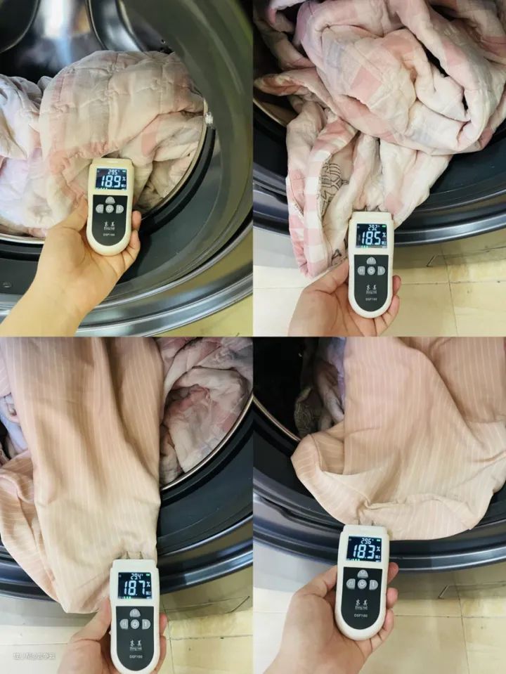 最后实际的烘干时间为50分钟,用水分测试仪测量被单和枕头套的含水率,都为0%,说明烘干效果很不错。而且我把整个被单抖散铺开测量,测了几个地方,结果都是为0%,说明烘干过程也很均匀。