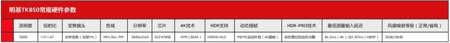 ⾸先,简单介绍下明基 TK850的硬件参数,主要参数如下方表格所示。其中最为亮眼的就是它的标称亮度高达3000流明,即使在光亮环境下投影,画面也非常清晰细腻。