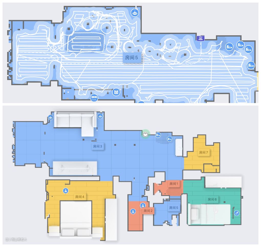 以楼主家约100㎡户型为例为例,科沃斯T10 OMNI建图速度约为6分钟,还能精确识别家具和房间类型,并根据识别出的房间类型主动推荐清洗方案。
