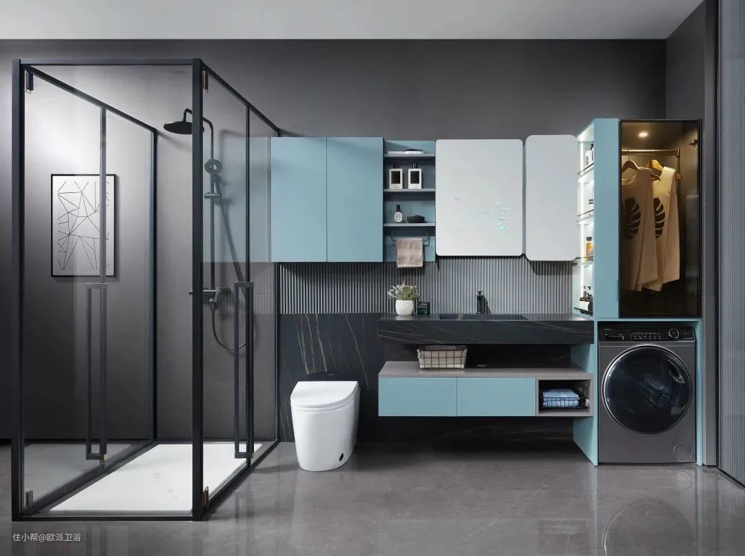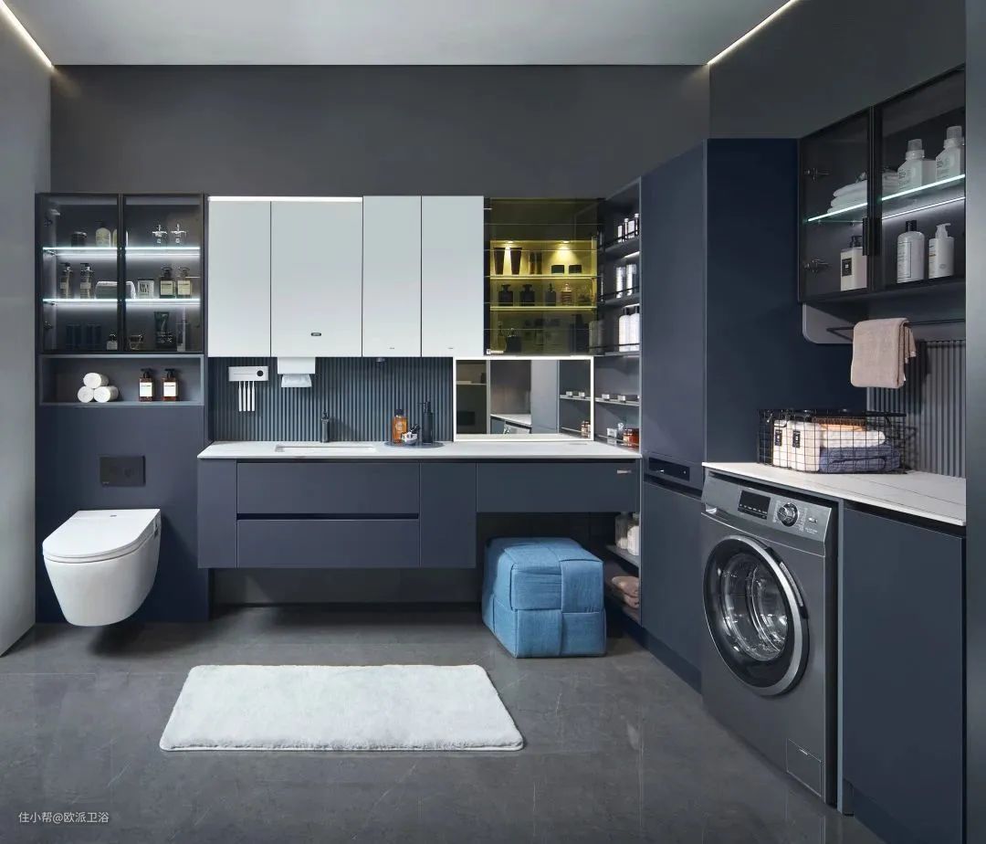 譬如你是个美妆达人,可以定制带有美妆冰箱的浴室柜,解决美妆用品储存不当的烦恼。如果你希望在浴室实现清洁需求的,可以通过定制把洗衣机嵌进浴室柜里!