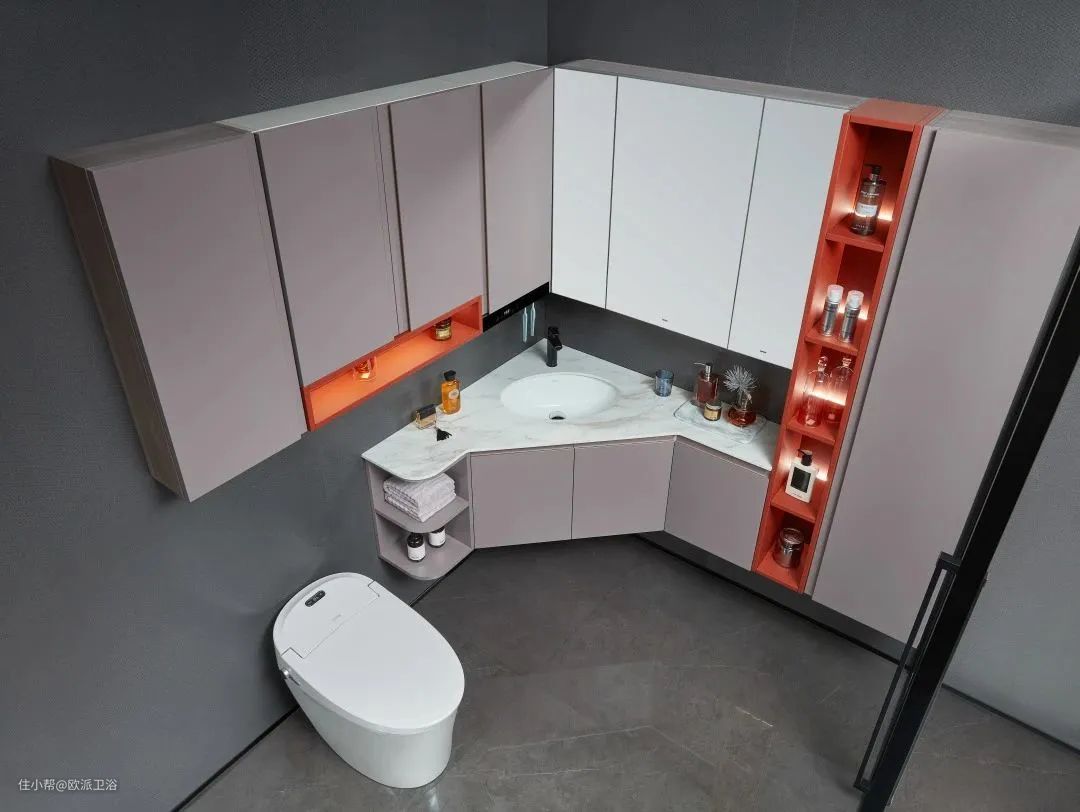 受户型的影响,每个人家里的卫生间或多或少都会有一些边边角角,比如鸡肋转角,要想利用好这个区域,就可以通过定制,将转角的两个墙面充分利用起来。比如五角柜布局形式,可以轻松实现扩容!