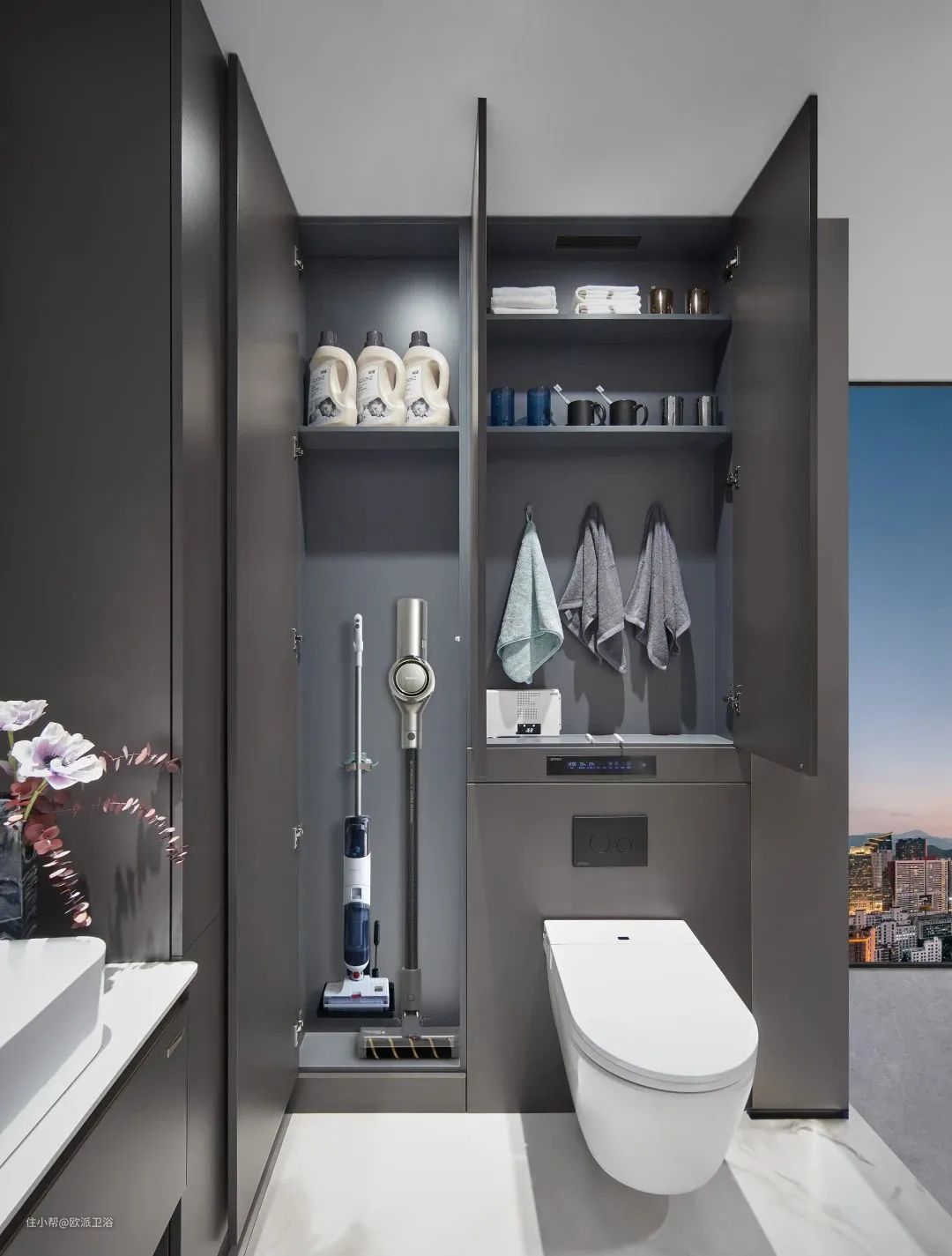 比如利用一些“闲置”或鸡肋的地方,通过在马桶上方设置吊柜,采用高柜到顶设计、延伸洗漱台面等等手段,以此来增加浴室的收纳能力!