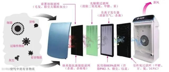 目前在售的空气净化器一般采用多块滤网/复合滤网,例如:空气先经过前置初级滤网过滤毛发、粉尘等,再经过HEPA滤网过滤pm2.5、细菌等,然后经过活性炭滤网滤除甲醛等有害气体。