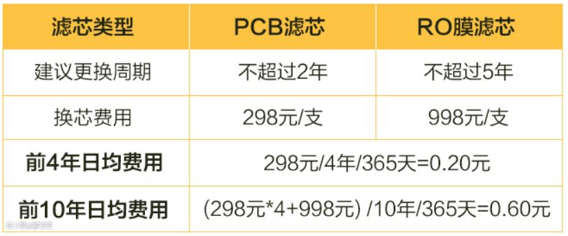 PCB滤芯建议2年一换,RO膜滤芯建议5年一换,算下来,前4年日均费用大概才2毛钱。