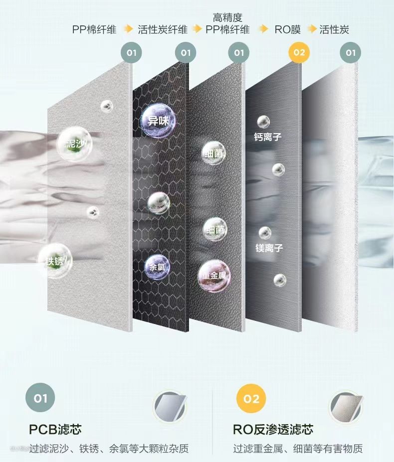 5合1复合滤芯及RO滤芯,可以高效滤除水中的细菌及重金属,让孕妈、宝宝也能放心直饮。