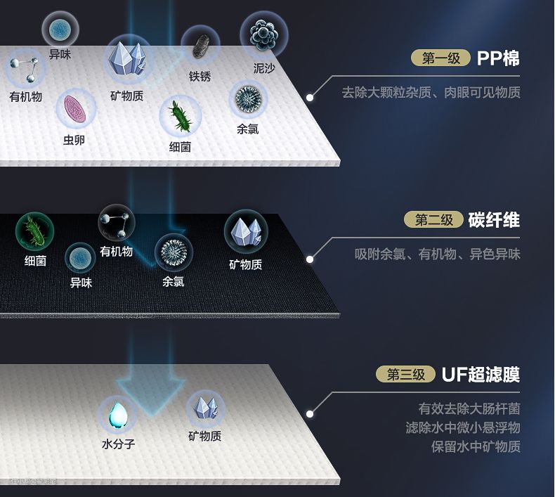 超滤净水器采用的是超滤膜(也叫UF膜),过滤精度约为0.01-0.1微米,可以过滤自来水中的余氯、细菌、铁锈、泥沙、虫卵、大分子有机物等,但无法过滤有机盐类和重金属离子等。