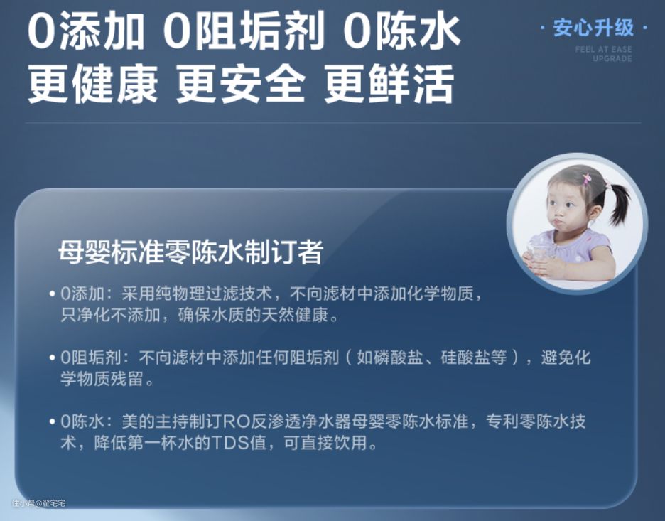 当初选择它也是因为它各方面数据都很优秀,1000G超大通量,比沁园和安吉尔等才600G的通量要大很多,日常泡茶、煲汤、冲奶、烹饪无需等待,取水更快更省时,体验更好;72.1%的产水率,超国家一级水效,比其他几款65%左右的产水率,要更节水更环保;0添加0阻垢剂双芯滤芯,不含有磷酸盐等成分的阻垢剂,纯物理过滤,避免了化学物质残留,相较于小米和安吉尔等添加了阻垢剂的净水器,长期饮用的话感觉要更安心更健康;全时零陈水专利,创新纯水回流技术,第一杯水也可以放心直饮,再也不用担心宝宝因为口渴乱喝水。