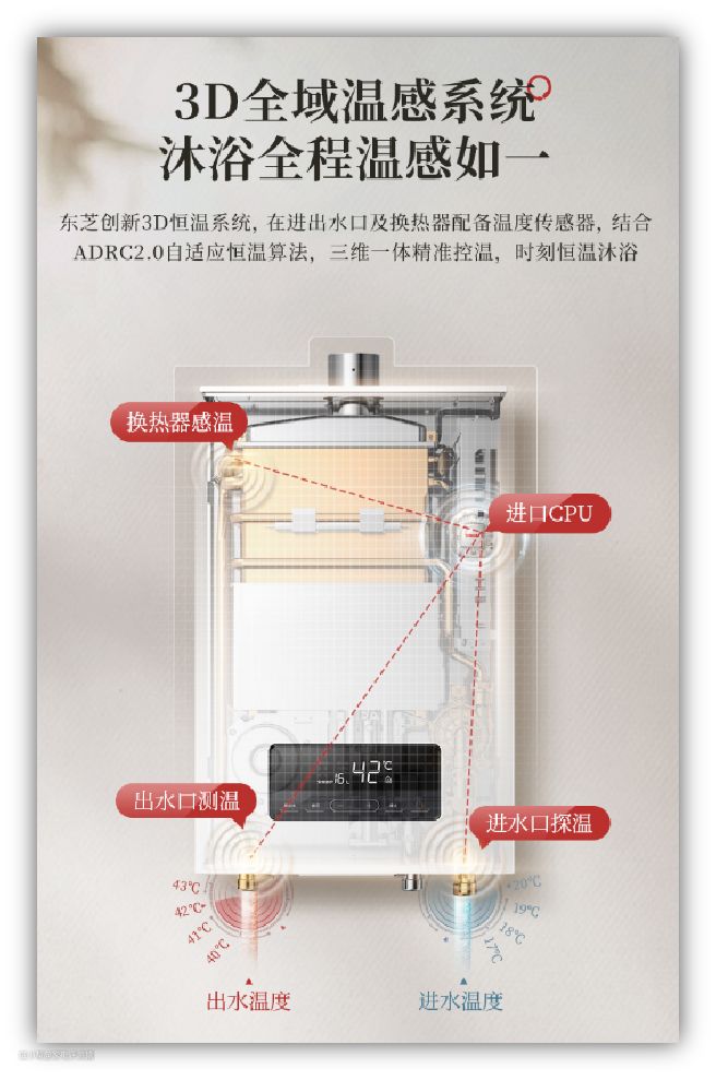 东芝TG3恒温机采用的3D恒温技术,在进水口、出水口、换热器三点都设置了温度传感器,自然是比1点测温、2点测温更加精准。此外,3个温度传感器协同工作还有一个好处就是长时间使用后即使某个传感器失效了,也能够依然保证产品的正常使用,不会出现烫伤等安全风险问题。据我了解,在业内还没有第二家品牌可以像东芝燃气热水器这样大手笔,豪横的在全管路设置温度传感器哦!