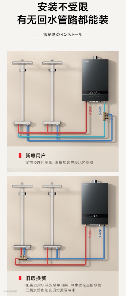 东芝TG6零冷水机型是不受回水管限制的,有无回水管的家庭都可以安装,节省了安装成本。