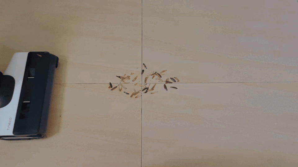 在干垃圾的测试上,我采用的测试材料是瓜子壳。瓜子壳颗粒比较大,一般清洁能力较差的洗地机很容易出现吸力不足而遗漏的情况,然后我们来看一下添可2.0led的清洁效果测试。