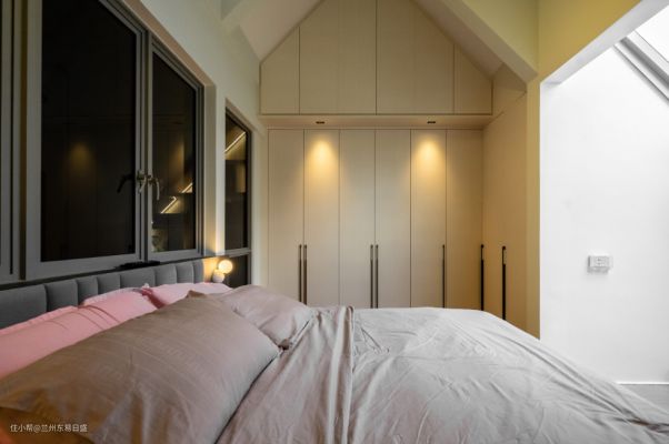 最后,您有一个现代室内设计为主卧室添加许多元素、形状和设计,使其脱颖而出。这是最多功能的主卧室,有黑色窗户,你可以打开采光,但它也与床头相匹配。另一方面,侧面区域有一个壁橱,上面有顶灯,既能提供适当的照明,又能提供隐私。