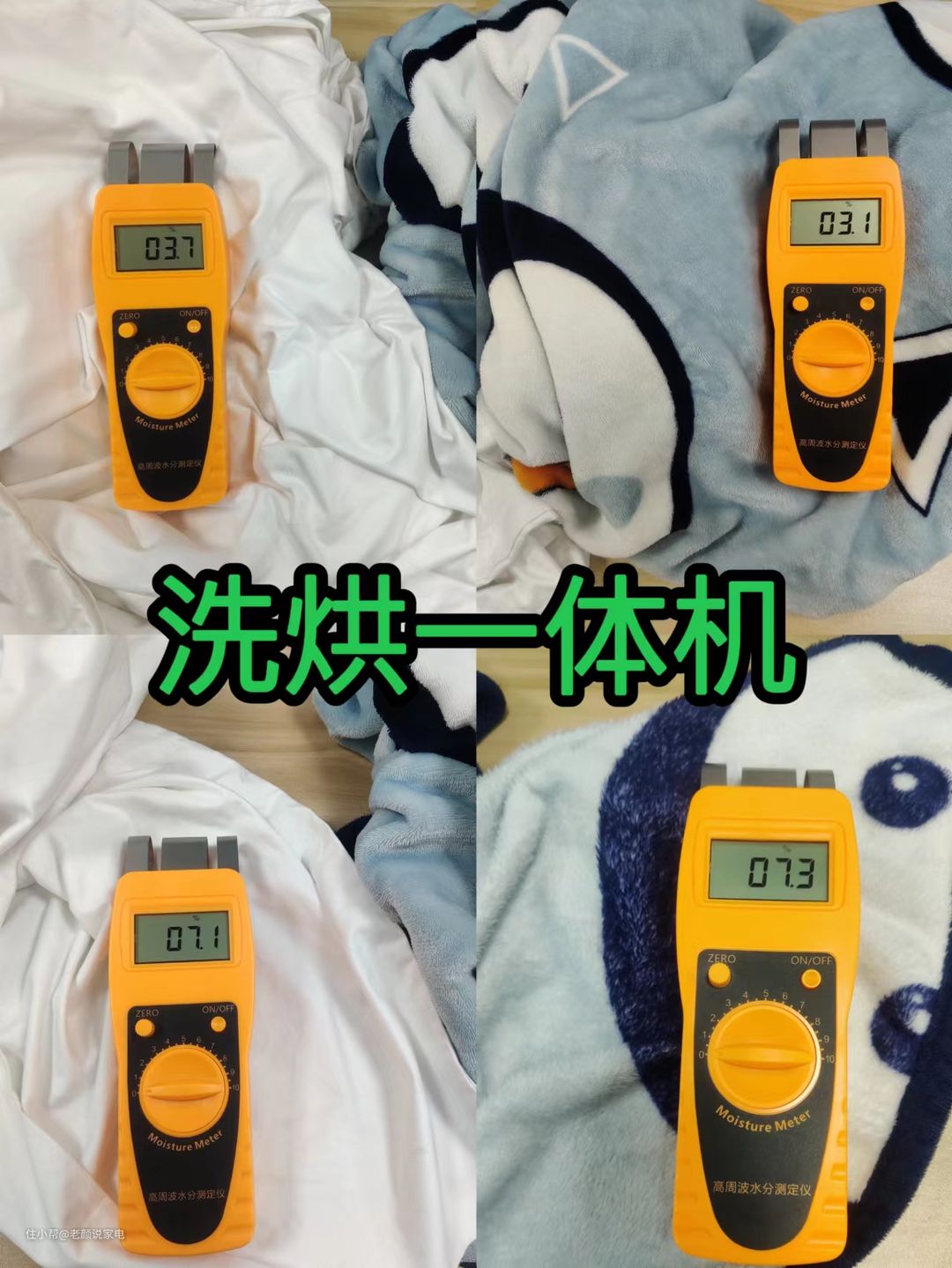 而热泵式在烘干后,没有出现烘干不均的情况,并且烘干后毛毯、被单的含水率都比洗烘一体机更低。