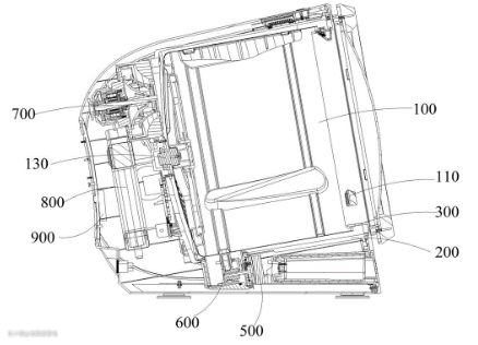 使得热空气对滚筒100内的衣物进行烘干。抽出后的空气经过冷凝器800将空气中的水分冷凝并排出或者存储于烘干机的水箱中。为了便于将冷凝器800中的空气快速的冷凝,在冷凝器800背对滚筒100的一侧设置有风扇组件900。