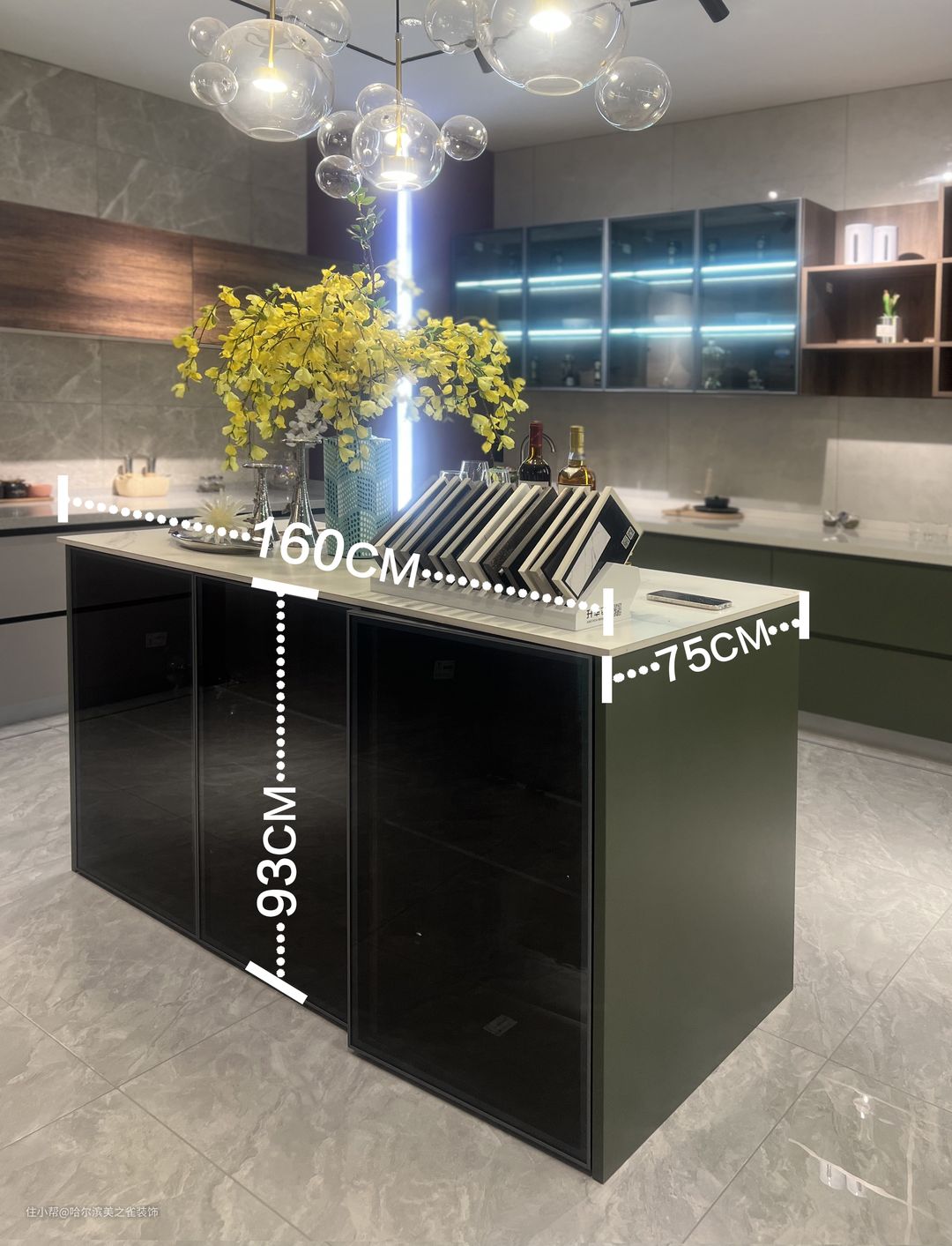 在不浪费一丝空间的基础上,设计出岛台既不浪费一丝空间又能兼顾空间的功能性,长160*宽750cm,作为平时冷餐的制作区域,作为平时洗切水果,日常烹饪的辅助作用。