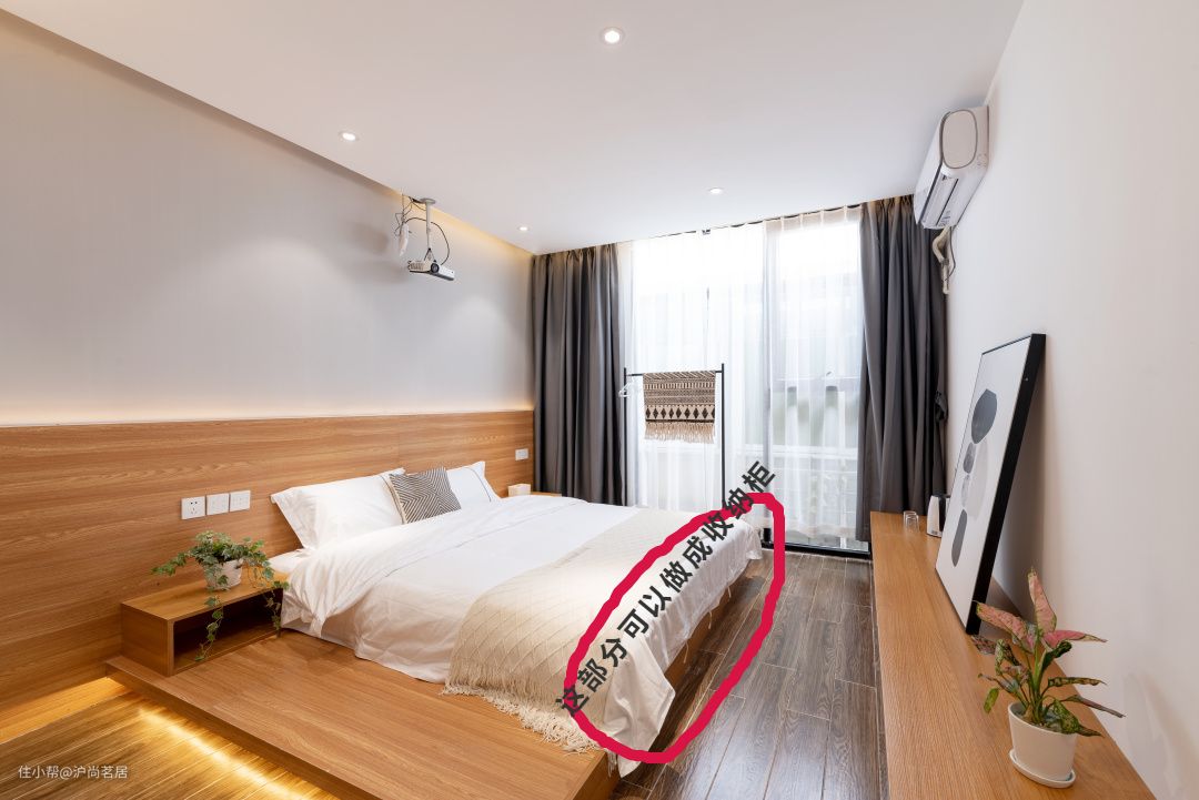 因为这样的地台是高出地面的木质结构,因此完全可以利用其作为收纳空间。比如在地台侧面做抽屉,睡觉、收纳两不误。
