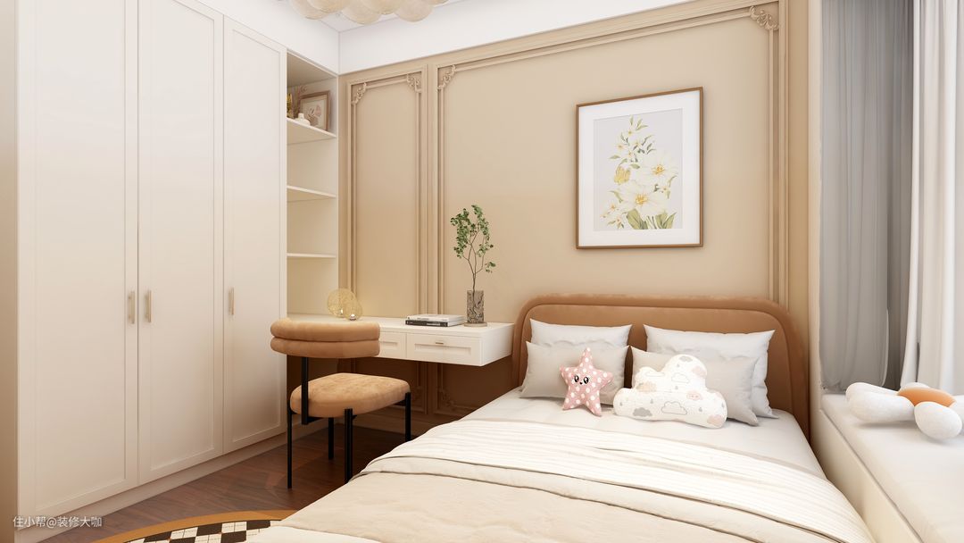 次卧和主卧相差不多,阳台变成了飘窗,吊顶灯是创意吊灯,同样的衣柜,墙面化妆镜改成了写作台,整个空间的采光要比主卧室好,适合孩子居住。