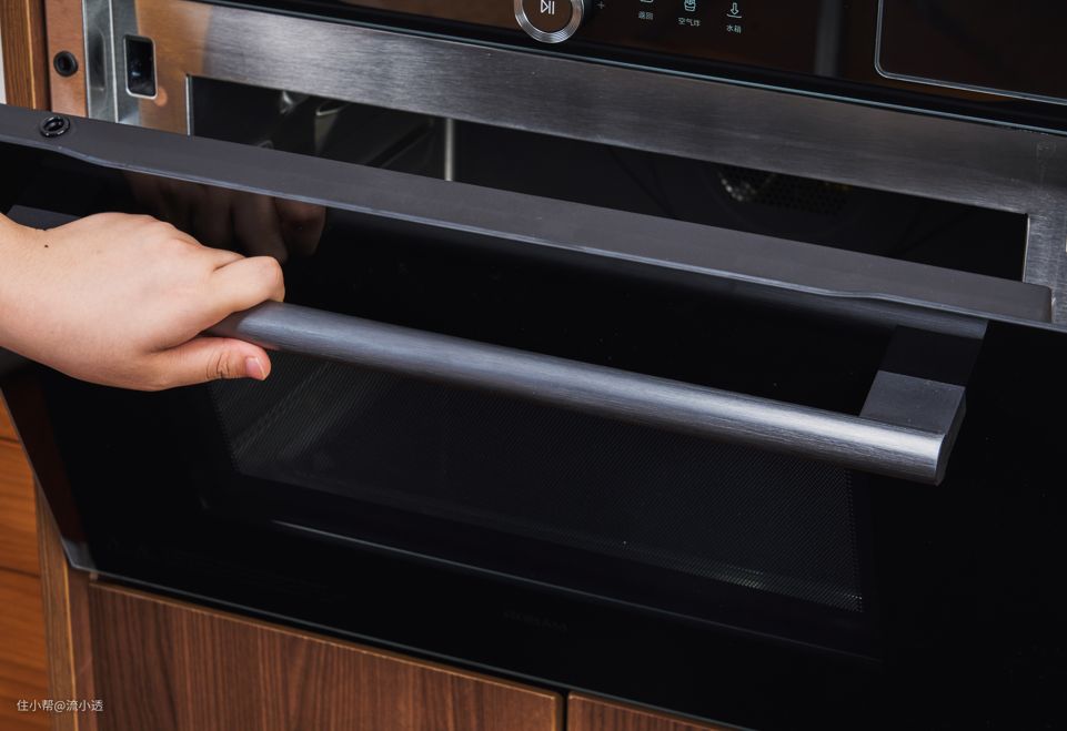 这款微蒸烤炸一体机,整体高雅黑晶造型,嵌入橱柜中,不显突兀,反而融合得很好。