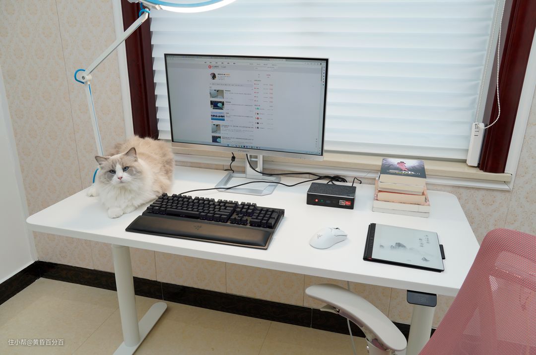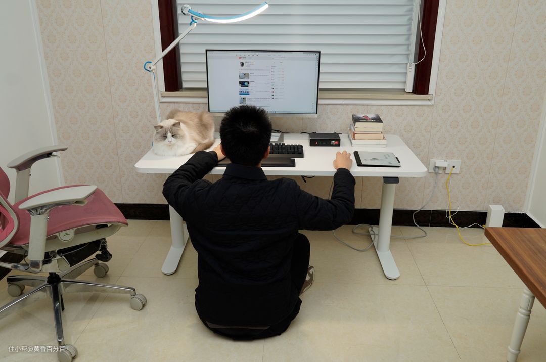 ▲Brateck北弧 T1有1.2x0.6米与1.4x0.7米两个尺寸,我这款是1.4x0.7米的,桌面空间还是比较宽裕的,放上一块27英寸显示器之后还能够放下我的书籍与电纸书,此时桌面依旧有足够的空间一个笔记本,再或者……一只肥猫,我家小白很喜欢卧在桌面上陪我,尤其夜深人静时,自己在书房读书、工作,猫咪在旁边打瞌睡,累了就可以撸一撸它缓解心情,还是很惬意的。