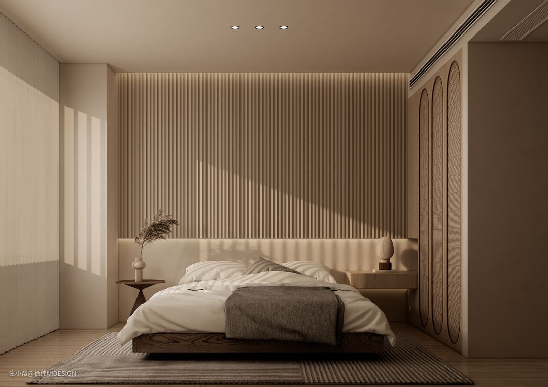 而吊顶、背景墙、储物柜则巧妙的使用极简线条元素,让整个空间层次分明,在恬淡色系的包裹下衍生出强烈的质感与美感。