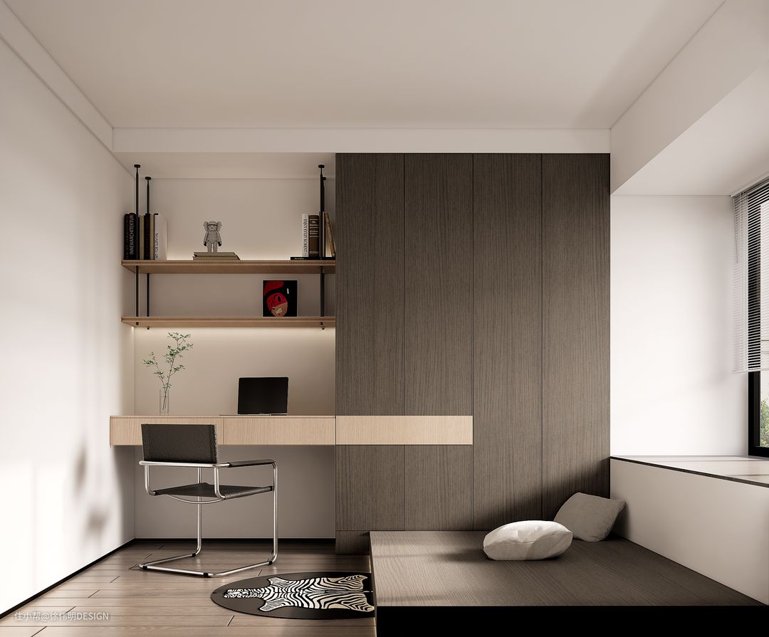 洁白的墙面、良好的采光、舒适的椅子,专注于高效、冷静的工作时间。深褐色的储物柜和榻榻米与奶白色交替结合,缓解视觉疲劳的同时增强舒适感与实用性。