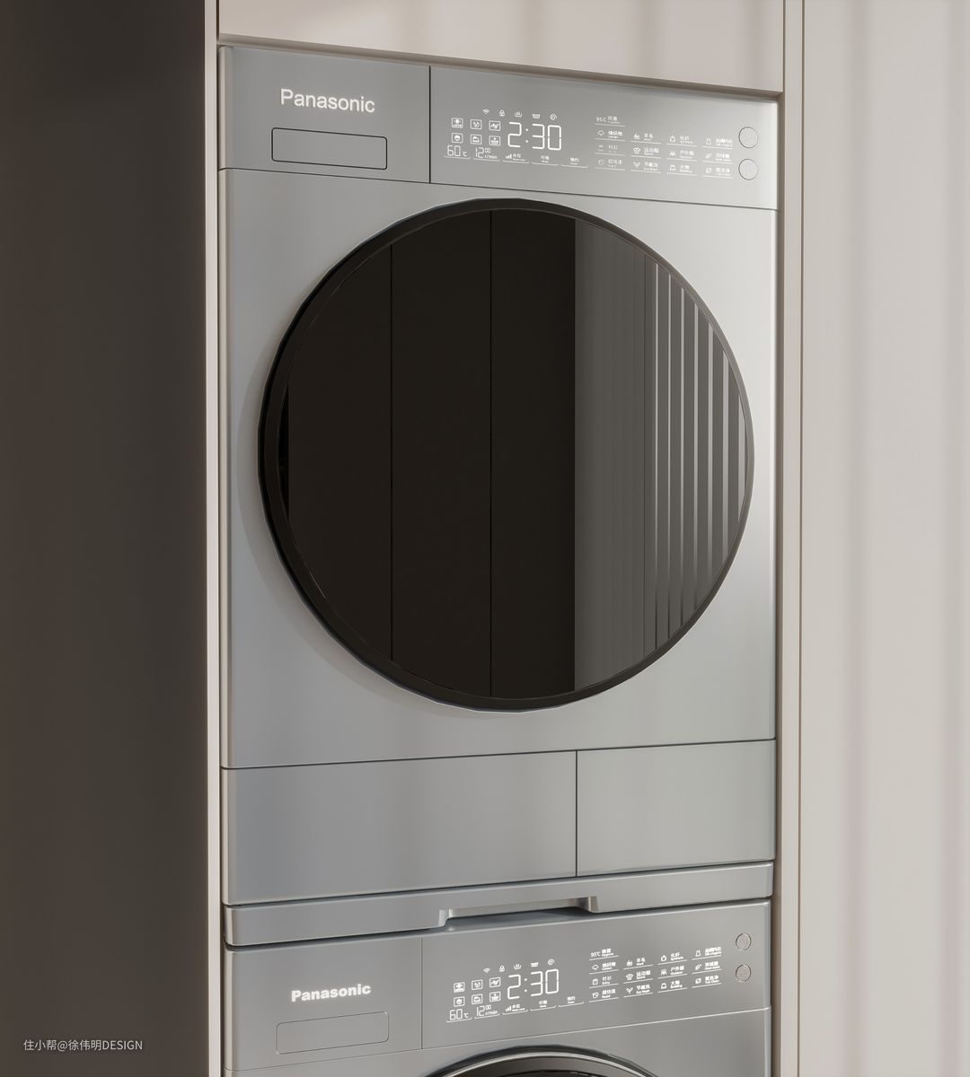 兼具生活功能和闲暇休憩的阳台,在储物柜中完美嵌入松下L165+9095T轻奢变频洗烘套装。极简的产品设计,高颜值的外观与整体色调相互呼应。